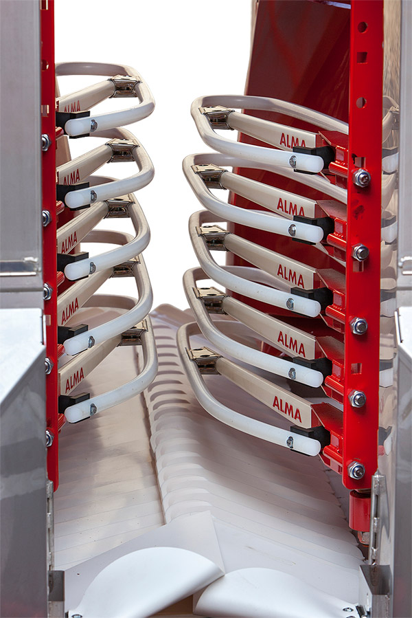 ·         La table de tri est constituée d’une série de rouleaux ameneurs qui séparent les baies intactes pour les faire tomber dans les bennes sans passer par l’égreneur. Les grappes et corps étrangers sont dirigés dans l’égreneur hélicoïdal pour le tri final.
