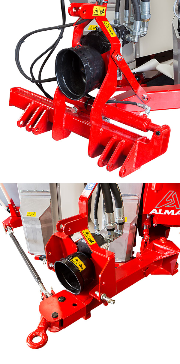 Attelage 3 points standardisé, coulissant pour position. Route/Travail. Option vérin hydraulique de déport commandé par le tracteur.